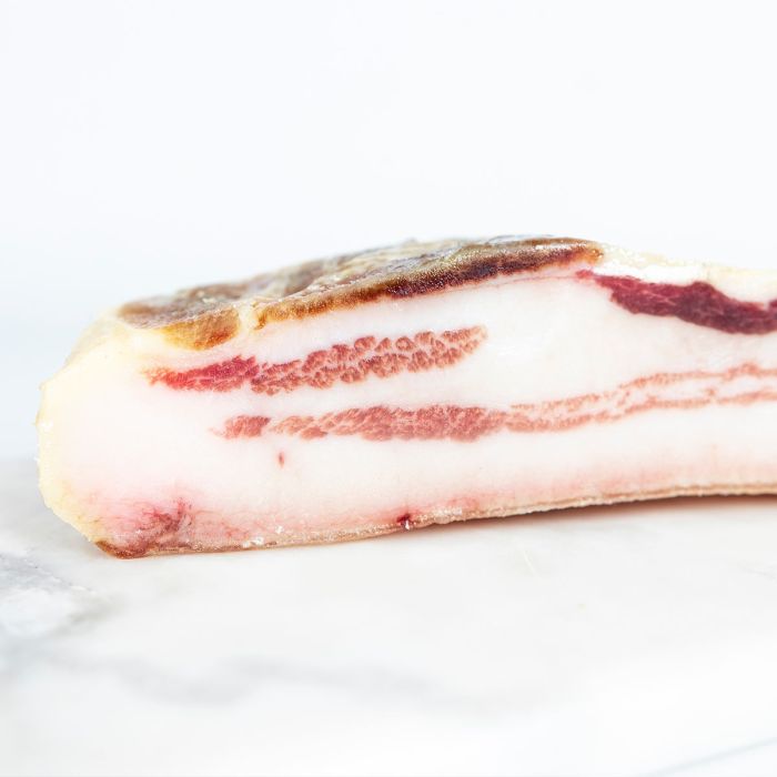 La calidad de la materia prima es esencial en la elaboración de nuestra panceta ibérica curada. Se seleccionan cuidadosamente las piezas de panceta con el equilibrio perfecto de carne y grasa, lo que garantiza un producto final excepcional.